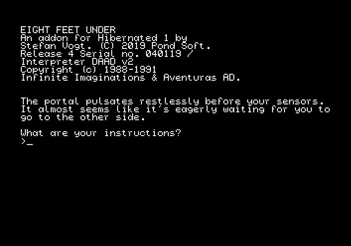 Более того — в честь такого события автор Hibernated 1 Стефан Фогт сваял аж целое дополнение под названием Eight Feet Under. Это тоже текстовый квест, события которого происходят в той же вселенной, а главной героиней, возможно, является всё та же Оливия Лунд (но это не точно). Судя по нескольким опубликованным скриншотам, она заходит в какой-то портал и оказывается явно не на корабле «Поларис-7», а в каком-то совсем уж недружелюбном месте.