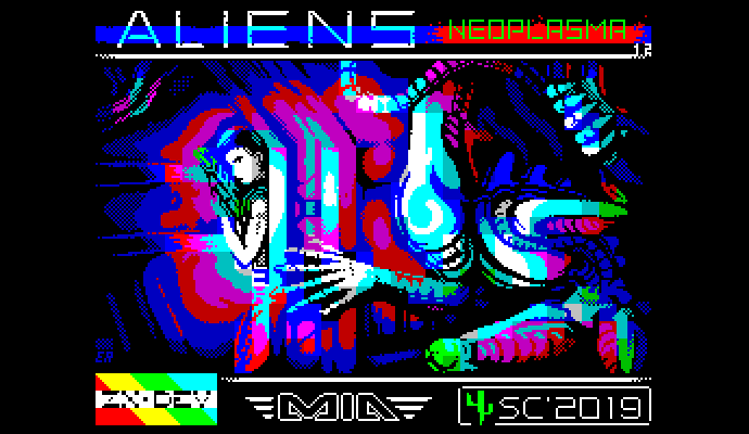 И последняя работа, заявленная на конкурс ZX Dev MIA - Remakes, о которой мы по-хорошему должны были рассказать сто лет назад. Да-да, это, разумеется, новая работа Александра Удотова, Евгения Рогулина и Олега Никитина — Aliens: Neoplasma.