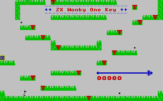 Вот и платформер ZX Wonky One Key мог пройти незамеченным, тем более что визуально игра смахивает на очередной, совсем уж простенький клон Jet Set Willy. Однако на деле всё куда сложнее — главный герой реагирует только на клавишу пробела: меняет направление движения на обычной поверхности и прыгает на трамплине. Так, периодически нажимая всего одну кнопку и громко ругаясь то ли на собственную криворукость, то ли на непослушного протагониста, нужно довести его до выхода. По дороге попадаются замедляющие пилюли, которые несколько облегчают прохождение, но ещё сильнее пожирают и без того ограниченное время.