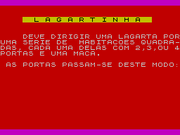 Португальская версия испанской игры Lagarta, опубликованная на кассете, приложенной к журналу Micro Pocket. Что-то вроде «Змейки», только собирать нужно яблоки, аккуратно расположенные в квадратных ячейках 3×3 знакоместа, и здесь не страшно упереться в своё туловище или в стену. Более того — сквозь стены с щербинкой нужно проползать, иначе до яблок не добраться.