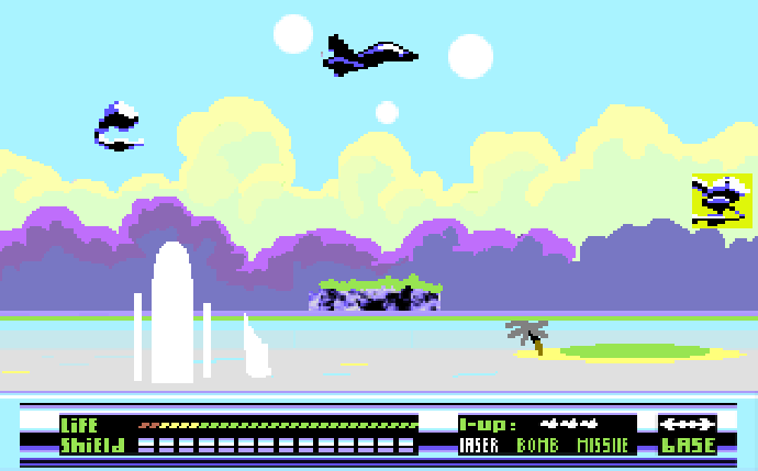 А зря — как минимум с технической стороны проект довольно интересный: разработчик использует в Parallaxian всевозможные техники для вывода нестандартных для C64 цветов, а также многоуровневый параллаксный скроллинг, причём как горизонтальный, так и вертикальный (куда более редкая штука на этой машине).