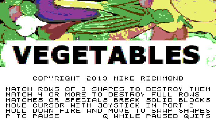 В апреле этого года из-под пера Майка Ричмонда вышла игра Vegetables в популярном (особенно на смартфонах) жанре «три фигуры в ряд». Между прочим, для Commodore 64, а не для этих ваших мобилок.