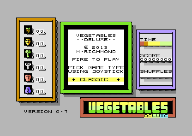 В апреле этого года из-под пера Майка Ричмонда вышла игра Vegetables в популярном (особенно на смартфонах) жанре «три фигуры в ряд». Между прочим, для Commodore 64, а не для этих ваших мобилок.