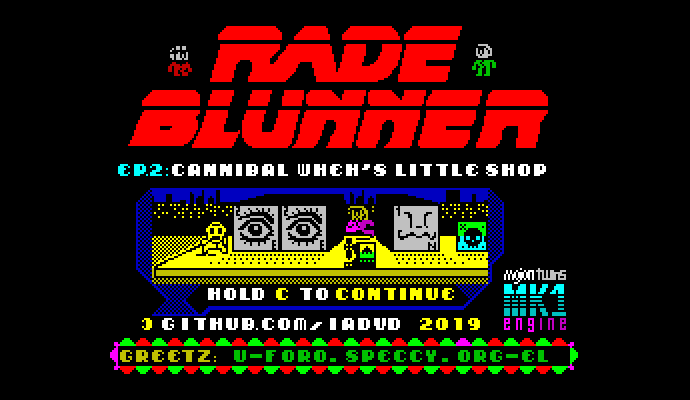 Платформер Rade Blunner, Episode 1: Weon Kolalski's Memories, выпущенный для ZX Spectrum испаноговорящим товарищем IADVD, спустя два месяца обзавёлся вторым эпизодом. Оригинальная игра звёзд с неба не хватала, эта от неё по геймплею не сильно отличается, так что выводы делайте сами. Впрочем, если первый эпизод Rade Blunner пришёлся вам по вкусу, то и Rade Blunner, Episode 2: Cannibal Wheh's Little Shop тоже наверняка зайдёт.