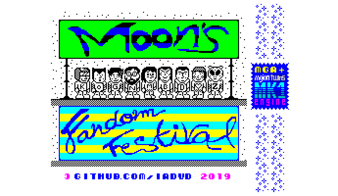 Собственно, первый созданный на MGA+MK1 квест называется Moon's Fandom Festival и повествует о ретро-энтузиастке Мун, которая обожает делать игры для ZX Spectrum. Своё новое творение она привезла на фестиваль Petunia Town Fandom Festival и уже приготовилась показать его собратьям по увлечениям... Одна проблема — Мун заперла игру в своём шкафчике и напрочь забыла пароль от замка. Чтобы вспомнить или каким-то другим образом восстановить пароль, девушке придётся как следует пообщаться с другими участниками и посетителями фестиваля, которые поначалу настроены не очень дружелюбно (сразу видно, что автор ни разу не был на таком мероприятии или ему просто сказочно не повезло), но терпение и труд, как говорится, и замок отопрут.