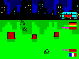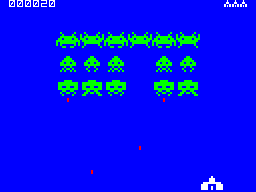 Типичный клон Space Invaders, только с перемещением всего на свете по знакоместам (точнее, сразу по трём, чтобы мало не показалось). Благодаря такому дискретному движению играть легче, хоть и не столь интересно, как в оригинал. Управление, кстати, нестандартное: для передвижения используются традиционные клавиши «O» и «P», а вот для стрельбы — почему-то «Q».