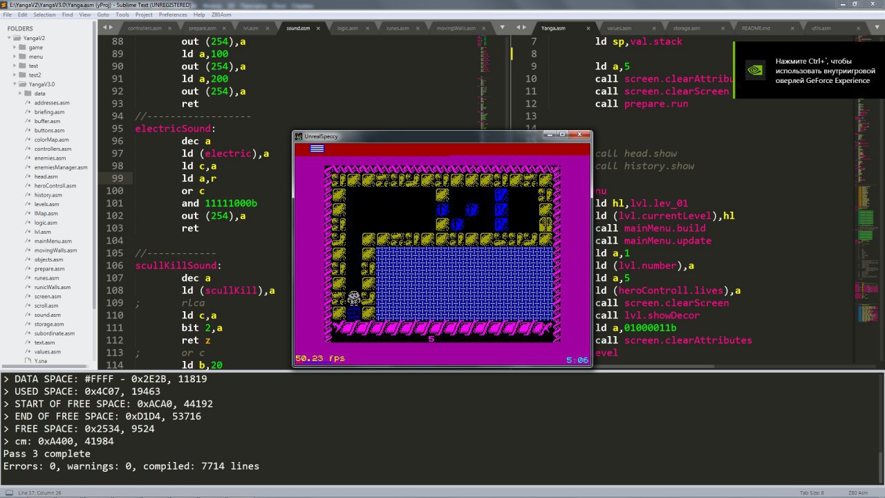 В графику немного могу. В детстве неоднократно пробовал работать в Pro Tracker и даже что-то получалось (мне так казалось на тот момент). Но тут я решил, что если игра под 48K, то и звуки должны быть соответствующие, то есть под бипер, с которым я никогда не разбирался. Да, ближе к дедлайну возникла мысль добавить биперные звуки, но реализовать не это удалось — время поставило точку.