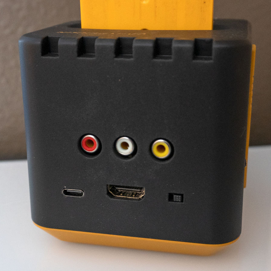 Retro N Jr. выглядит как симпатичный пластиковый кубик в чёрно-жёлтой раскраске со слотом для картриджей от вышеперечисленных консолей и двумя видеовыходами: HDMI (720p) и композитным. Также имеются: порт USB-C для зарядки, выход для наушников с регулятором громкости рядом и зачем-то ещё один USB-порт, но уже обычный. Возможно, тоже для зарядки, а может, для каких-то иных целей (в конце концов, в релизе его могут и убрать).