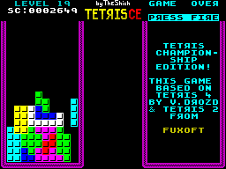 Уже сейчас с помощью Tetris Championship Edition можно спокойно проводить локальные чемпионаты по «Тетрису» на Spectrum — спасибо заранее заложенной в Tetris 2 возможности выдавать двум игрокам одинаковые фигуры (на NES для этого нужен специальный хак, да и режима на двоих там нет). А когда TheShich доведёт свою разработку до совершенства, это будет вообще один из лучших «Тетрисов» на всех платформах.