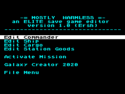 В редакторе под названием Mostly Harmless - an ELITE save game editor можно как создать нового капитана, так и загрузить существующего, а также поменять свои характеристики (имя, статус, уровень и так далее), экипировку корабля, внутренности грузового отсека, наличие товаров на станции, выбрать своё местоположение (галактику и планету), активировать все три миссии и многое другое. Более того — если восьми галактик и 2048 планет вам не хватает, можно воспользоваться утилитой Galaxy Creator 2020 и сгенерировать другие восемь галактик! А потом полюбоваться звёздной картой, чтобы оценить масштаб событий.