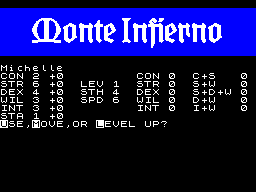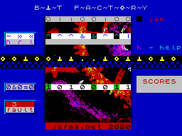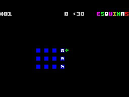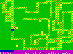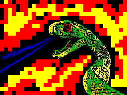 На первый взгляд — банальная «Змейка», на второй — несколько более интересная игра. Здесь на каждом из пяти уровней у вас есть цель — погасить все источники огня (красные квадратики), предварительно набрав в пасть побольше воды (синие квадратики). Более того — начиная со второго уровня ваша змея начинает прятать части своего тела в траву (они менее яркие), и через них можно переползать. Наконец, змею всегда можно остановить нажатием пробела. На самом деле если снабдить FireSnake нормальной графикой и чуть-чуть улучшить управление (читай — переписать на ассемблере или хотя бы скомпилировать), то получится более чем достойный клон «Змейки». Хотя и сейчас играется всё довольно неплохо.