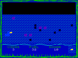 Вы управляете подводной лодкой, которая должна проплывать экран за экраном, избегая глубинных бомб и по возможность собирая горючее.