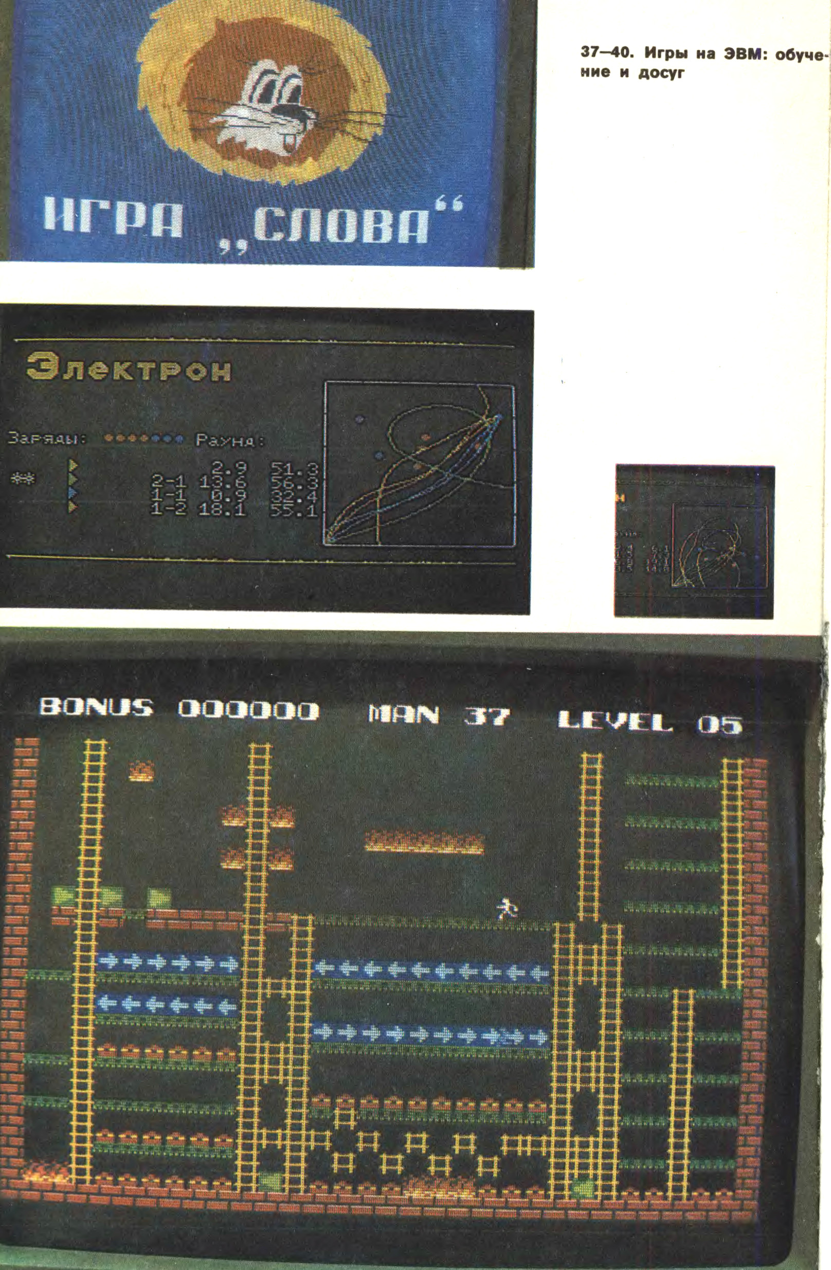 Лютой радости моей не было предела! И, с интересом разглядывая каждую из фотографий, я пыталась в уме восстановить ход мыслей и чаяния людей, с таким энтузиазмом вложивших столь необычные изображения в компьютер. Были там и снежная баба на Бейсике, и лежащие стопками изометрические плитки в программе «Строитель», и графический редактор от НИИ ядерной физики МГУ с рисунком новогоднего поздравления, и какие-то объёмные разноцветные шарики-молекулы в программе «Гратекс». И в самом-самом конце — они, игры! При этом всё было такое загадочное-загадочное и не во всём понятное ребёнку.