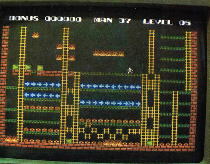 А одна из этих картинок с играми меня просто околдовала, самым невероятным образом повлияв на моё будущее. На самой последней иллюстрации в учебнике была изображена игра-платформер, чем-то визуально схожая как с уже известной мне тогда Lode Runner для Dendy (за минусом скроллинга), так и с популярной буквально на всех советских компьютерах игрой «Клад», в вариант которой мне также довелось немного поиграть. Необычная композиция из странного уровня с висячими горящими огнями, высокими лесенками и сундуками выглядела ещё более или менее понятно. Глаз же цеплялся за целые вереницы загадочных стрелочек, отсутствующих во всех вышеперечисленных играх и заставляющих ломать голову в попытках их понять.