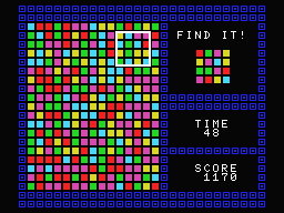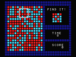 Простая по сути головоломка, в которой вам нужно искать небольшой паттерн из цветных квадратиков на большом поле из таких же цветных квадратов. На лёгкой сложности, когда имеется пять разных цветов, это особых проблем не вызывает, но вот на максимальной, когда цвета всего два, придётся как следует напрячь глаза. Для справки — в основе Find It! лежит игра Where Is It? для Colecovision.