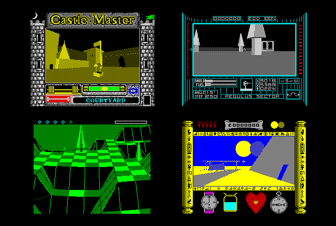 Выяснилось, что больше всего от турбо-режимов (особенно 28 МГц) выгадают игры на движке Freescape: Driller, обе части Total Eclipse, обе части Castle Master, Dark Side и, надо полагать, все фанатские проекты, сделанные с помощью 3D Construction Kit. Замечательно выглядит и играется шедевр The Sentinel, который тоже щеголяет векторной графикой с заливкой.