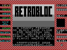 Скромные парни из студии Krappygamez тихо и незаметно выпустили на ZX Spectrum головоломку Retrobloc. Многие узнают в ней игру Blockout, сделанную в 1989 году поляками Александром Усташевским и Мирославом Заблоцким для игровых автоматов, а затем портированную на множество домашних платформ, включая Amiga, Commodore 64 и Mega Drive. Впоследствии Nintendo даже перенесла эту игру на свою злосчастную консоль Virtual Boy, но поменяла название на более понятное — 3D Tetris.