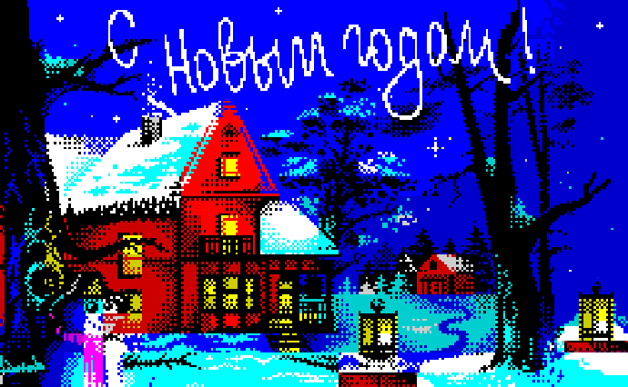 Что до нашего сайта, то планов у нас по-прежнему громадьё, но мы, пожалуй, не будем их озвучивать, чтобы не сглазить (и не накликать очередное несчастье на весь мир). Просто по старой традиции поделимся с вами подборкой хороших картинок для ZX Spectrum на зимнюю и новогоднюю тематику. Большое спасибо их авторам: prof4d, Gas13, r0bat, Vassa, Andy Green и Mixer.