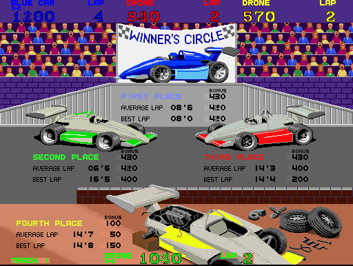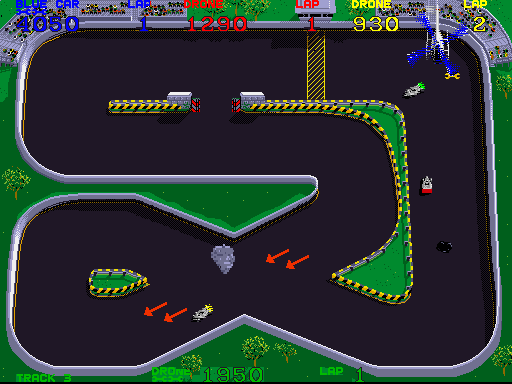 В 1986 году компания Atari Games выпустила для аркадных автоматов игру Super Sprint. В ней игроки рулили скоростным болидом, похожим на те, что используются в гонках Формулы-1. Автомобили рассекали по восьми извилистым трекам, расположенным на одном экране с видом сверху. Одновременно принимать участие в заезде могло до трёх человек сразу, а простая система улучшений позволяла повышать максимальную скорость, управляемость или разгон.