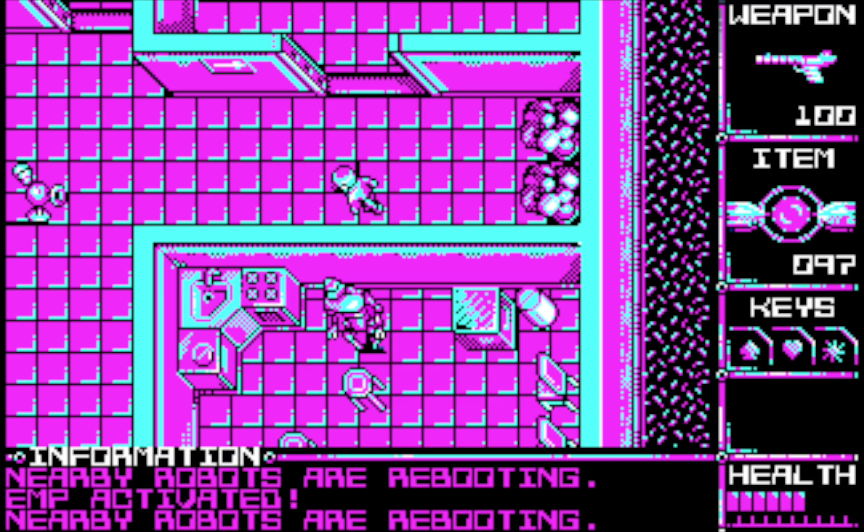 Как известно, у Commodore PET нет графического режима, зато имеется набор символов PETSCII, содержащий кучу неплохой псевдографики. В качестве жанра Дэвид выбрал экшен с видом сверху в аксонометрической проекции. После создания играбельной версии стало понятно, что игру можно без проблем перенести сначала на Commodore 64, добавив цвет и улучшенную графику, а потом на VIC-20. В итоге все три версии содержат практически идентичный код (примерно на 90-95%), но отличаются визуально.