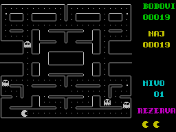 Хорватский клон неизвестного года выпуска, но тоже очень приличный. Да, геймплей здесь повторён даже близко не так хорошо, как в Spekku-man, да и графика почему-то монохромная, хотя лабиринт размером 25×22 вполне вписывается в экран «Спектрума». Но Пакман перемещается по лабиринту плавно, играть весело — что ещё нужно?