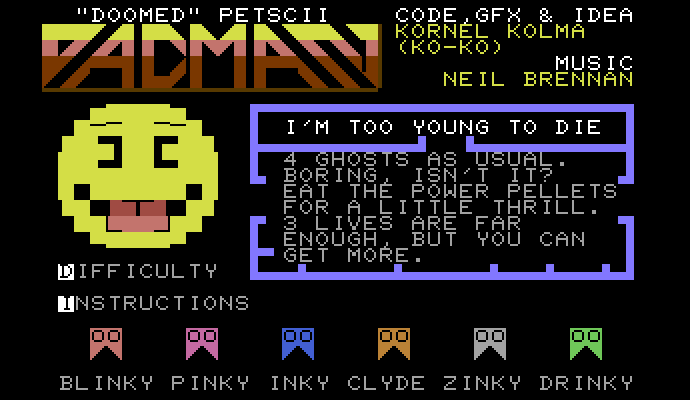 Doomed PETSCII Pacman сделал программист с ником Ko-Ko, а скачать её можно как с нашего сайта (версия для C64, версия для Plus/4), так и с itch.io (С64, Plus/4).