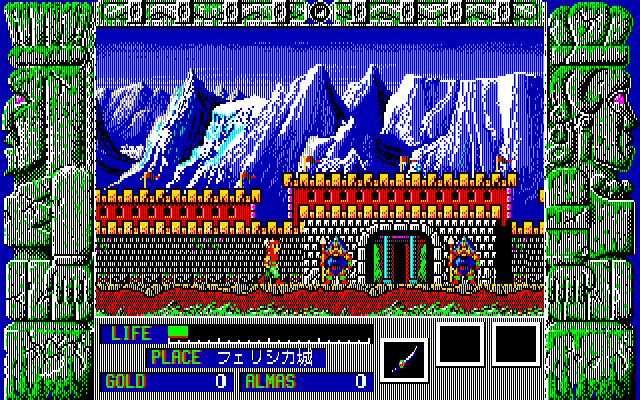 Цветов у БК куда меньше, чем у того же PC-88 — на экран можно одновременно выводить всего 4 штуки (хотя есть несколько палитр). Слава богу, на PC Zeliard работает не только в MCGA и EGA, но и в CGA-режиме, который отлично подходит для переноса на советский компьютер. Выглядеть это будет примерно так (слева — палитра 13, справа — 04):