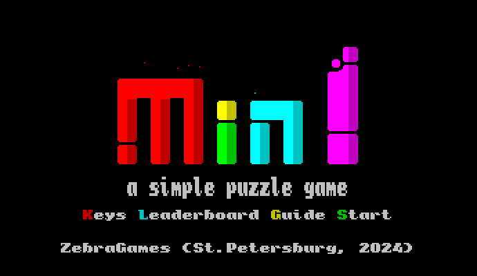Неожиданный подарок прибыль к нам из Санкт-Петербурга. Какая-то совершенно новая студия ZebraGames, возглавляемая, видимо, Андреем Яковлевым (по крайней мере, он в ней отвечает за код, графику и релиз), выпустила на ZX Spectrum симпатичную головоломку Min!, портировав её с «Андроида».