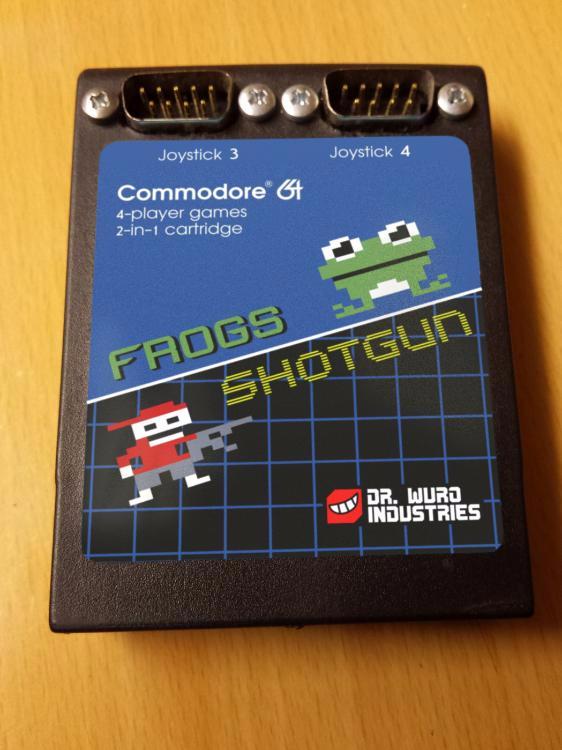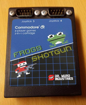 Очень любопытный картридж планирует выпустить в августе компания Dr. Wuro Industries. Во-первых, на нём находятся сразу две игры — аркада Frogs и стрелялка Shotgun. Во-вторых, прямо на картридже расположены два дополнительных разъёма для джойстиков, которые увеличивают возможное количество игроков до четырёх.