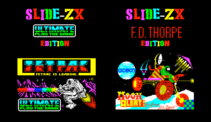 Но теперь другое дело! Замечательный сайт Planeta Sinclair напомнил нам, что Аллан обновил свою игру, заменив весь арт на заставки из игр Фредерика Дэвида Торпа: Moon Alert, Hunchback, Head Over Heels, Batman, Spy Hunter и далее по списку. Теперь игра называется Slide-ZX F.D. Thorpe Edition.