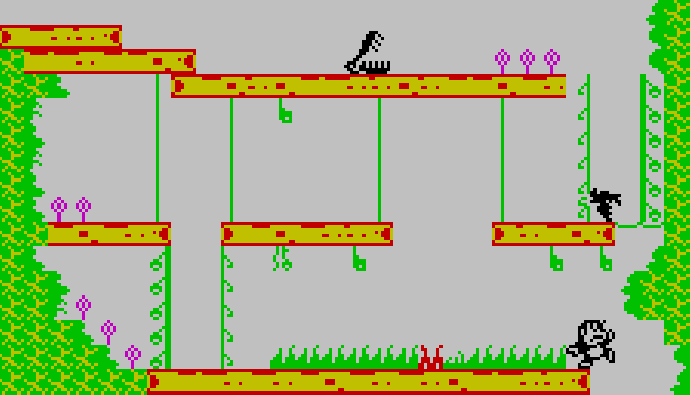 Вот и четвёртая игра, поступившая на конкурс ZX Dev - Conversions — Baby Monkey Alba, которую делает некто Хавьер. За основу он взял классическую электронную игру Donkey Kong Jr. — одну из представительниц линейки Game & Watch, которую успешно клонировали в СССР («Ну, погоди!», «Тайны океана» и так далее).