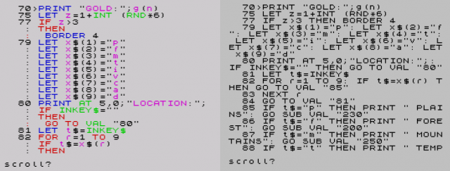 Несмотря на наличие нескольких багов (номера строк печатаются текущим цветом INK, управляющие коды должны быть видны в режиме редактирования), модификация уже вполне работоспособна и значительно облегчает чтение и анализ старых Бейсик-программ.