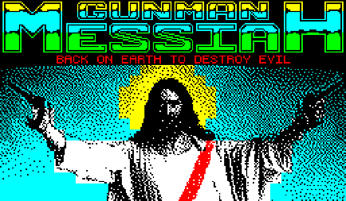 Официальный сюжет утверждает, что Мессия вернулся на Землю и теперь вооружён двумя пушками! Цель игры проста: стрелять во всё, что движется, и не давать пушкам перегреться. Да, Gunman Messiah — это вертикальный скролл-шутер с элементами «буллет-хелла», который легко влезает даже в ОЗУ ZX Spectrum 16K.