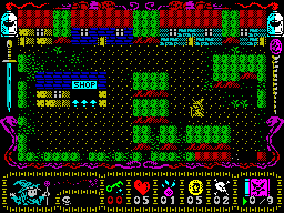 Знай себе бегай по экранам, ищи страницы какого-то гримуара, пуляй во врагов маной, собирай ключи, копи монетки и пополняй с их помощью всякие запасы в магазине. Да и выглядит всё это не очень стыдно, что для игр на ZXGM, опять-таки, редкость.