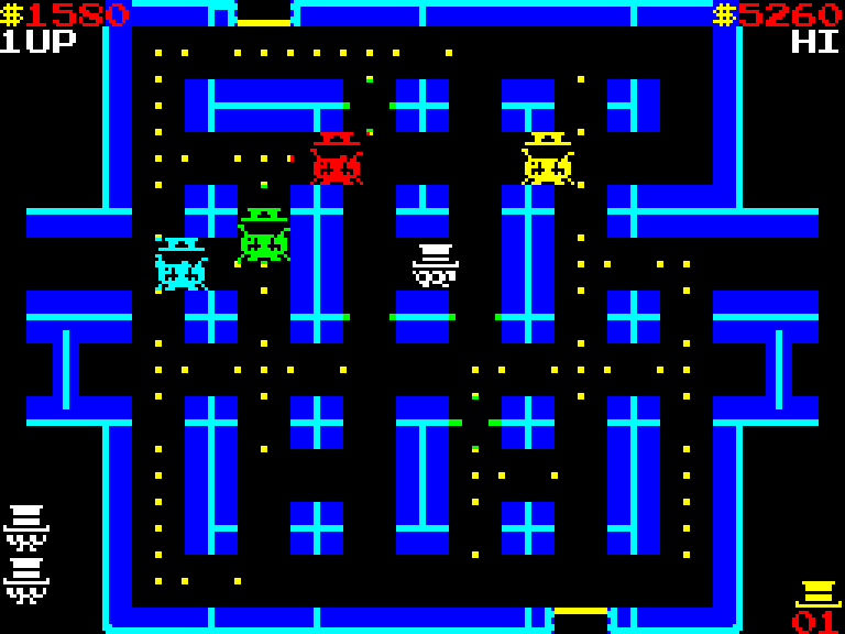 Почти все предметы, которые появляются на экране, просто приносят вам дополнительные очки. Хотя если сцапать мешок с золотом, то полицейские ненадолго замрут на месте (видимо, от шока), что даст вам небольшую передышку. Ах, да, и после того, как вы соберёте все монетки, надо будет ещё добежать до выхода, иначе уровень не будет считаться пройденным.