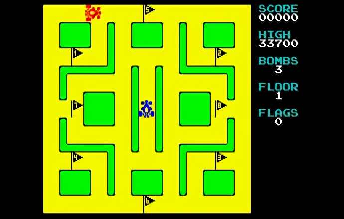 Фактически, Аллан взял код своей же Terrapins и переделал все спрайты (плюс немного геймплей), чтобы получить клон Rally X — гонки по лабиринту, в которой нужно собрать все флаги на уровне, опередив вражеские машины. Оригинальная игра вышла из-под пера Namco на игровых автоматах в 1980 году, а спустя 37 лет таким вот хитрым образом перекочует и на «Спектрум».
