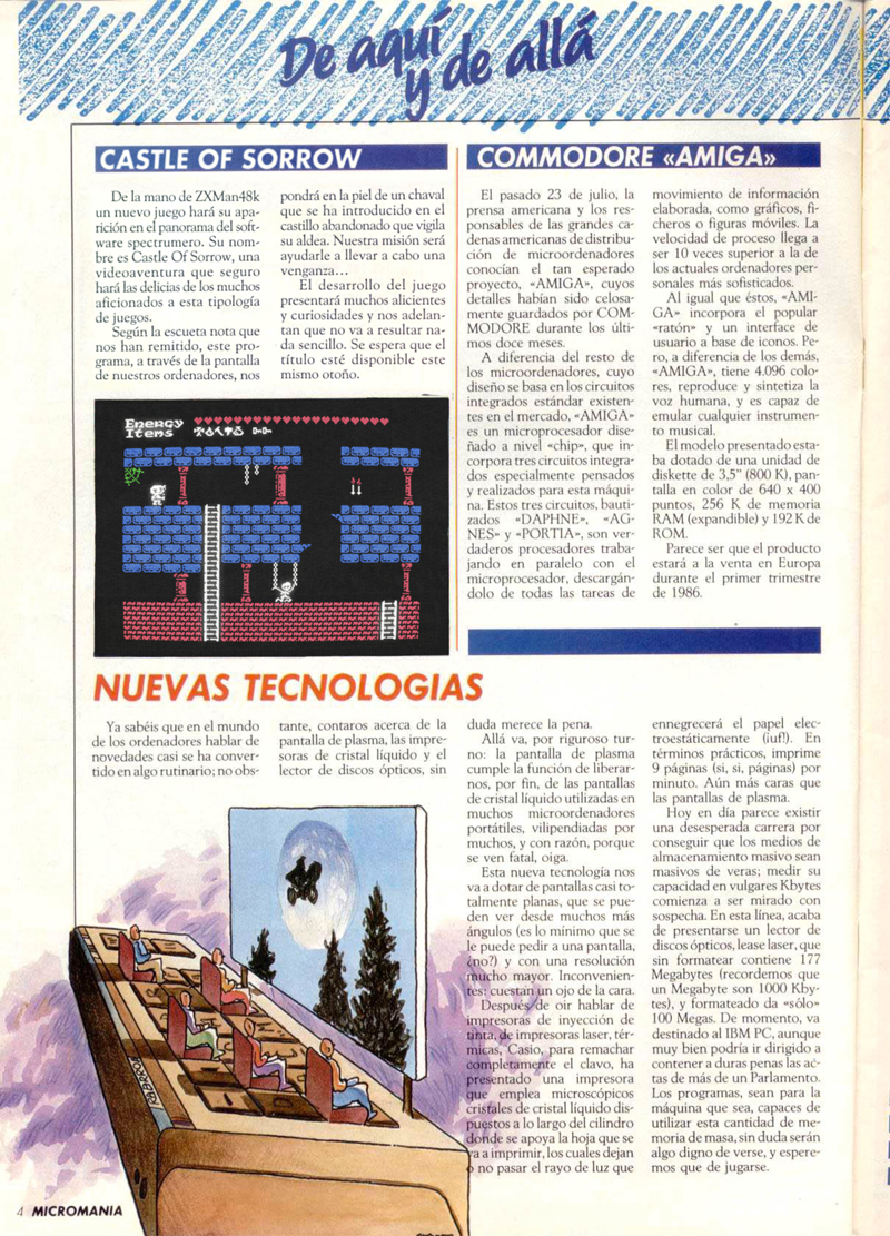 К слову, в чём этому товарищу не отказать, так это в смекалке — анонс он сделал на форуме испанского сайта Speccy.org в виде отсканированной страницы старого журнала Micromania, подставив вместо одной из заметок информацию про свою игру. Играть в Castle of Sorrow придётся за мальчика, который отправляется в заброшенный замок, дабы отомстить за свою деревню. Или за кого-то из деревни — сложно сказать.