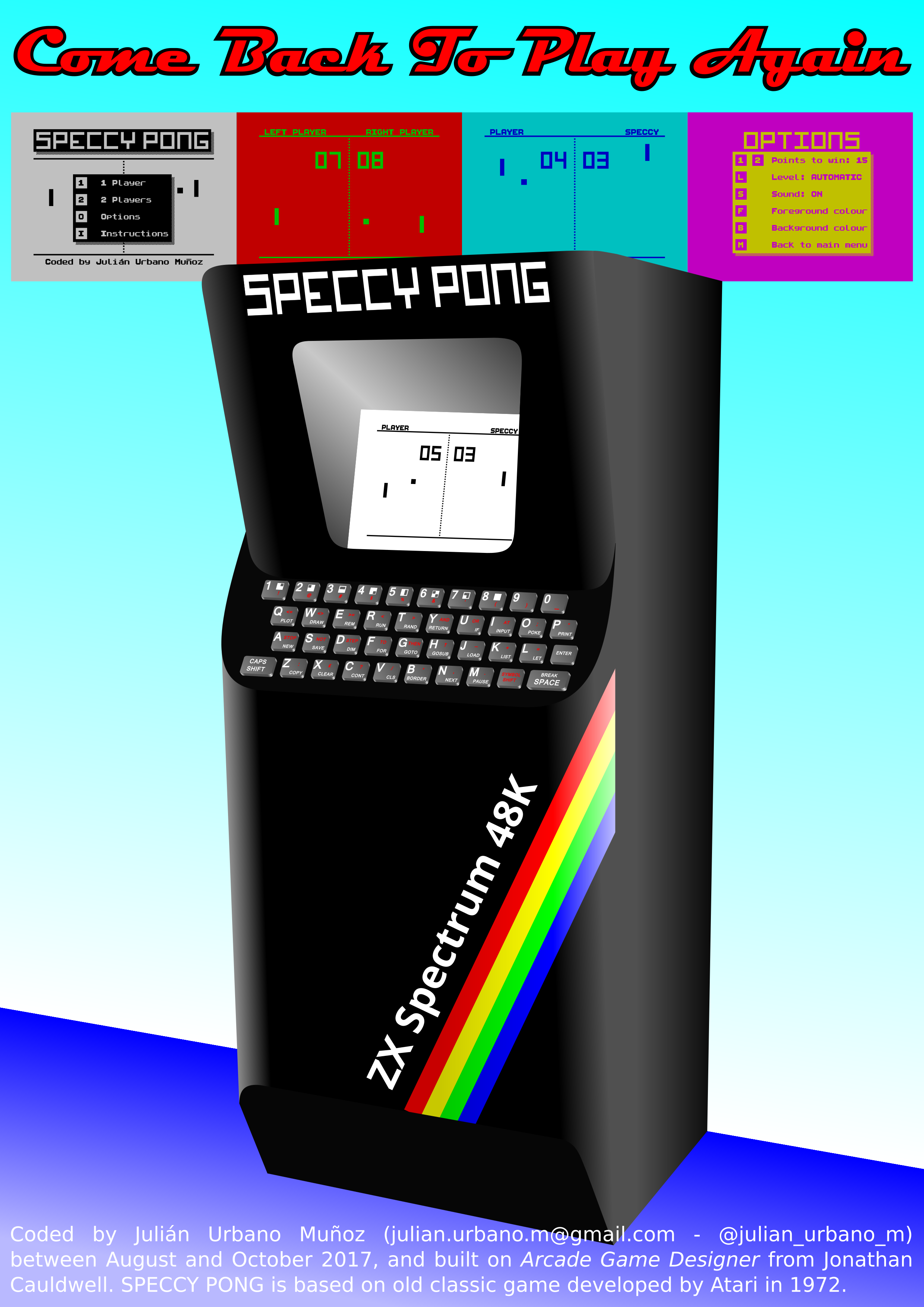 На конкурс ZX Dev - Conversions поступила ещё одна игра — Speccy Pong. Сделал её Хулиан Урбано Муньос при помощи движка Arcade Game Designer и немного — ассемблера Pasmo.