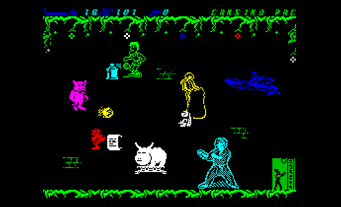 Получилась вполне играбельная аркада, в которой нужно летать по экрану, избегая назойливого внимания какого-то манускрипта, собирать баллончики с краской и подкрашивать предметы соответствующего цвета, делая их всё более и более видимыми. В итоге на экране во всю красу предстаёт несколько спрайтов из известных спектрумовских игр (рисовать alboran70 не умел, поэтому понадёргал графику откуда ни попадясь), а главный герой (который прилетел прямиком из Jetpac) получает возможность пройти на следующий уровень. И так пока не закончатся все экраны, хотя после этого можно сменить уровень сложности и попробовать ещё разок.
