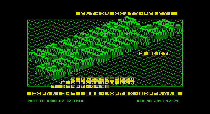 Какое-то время назад автор уже выпускал неиграбельную демо-версию, а теперь довёл её до более-менее финального состояния. Теперь любой владелец этой системы или соответствующего эмулятора может скачать свежий билд, запустить игру, нажать кнопку «6» в главном меню и наслаждаться прекрасной изометрической графикой Коста Панайи на «УКНЦ».